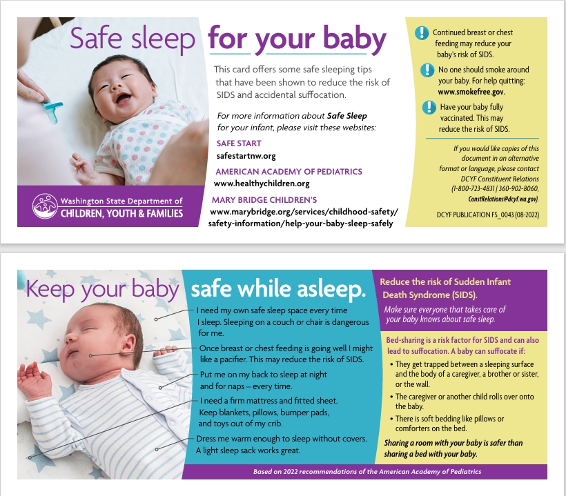 Parent Trust for Washington Children co-chairs the Infant Safe Sleep Coalition to ensure that all parents of infants receive critical new information provided by the American Academy of Pediatrics to prevent Sudden Infant Death Syndrome (SIDS) and Sudden Unexpected Infant Death (SUID) due to unsafe sleep environment.